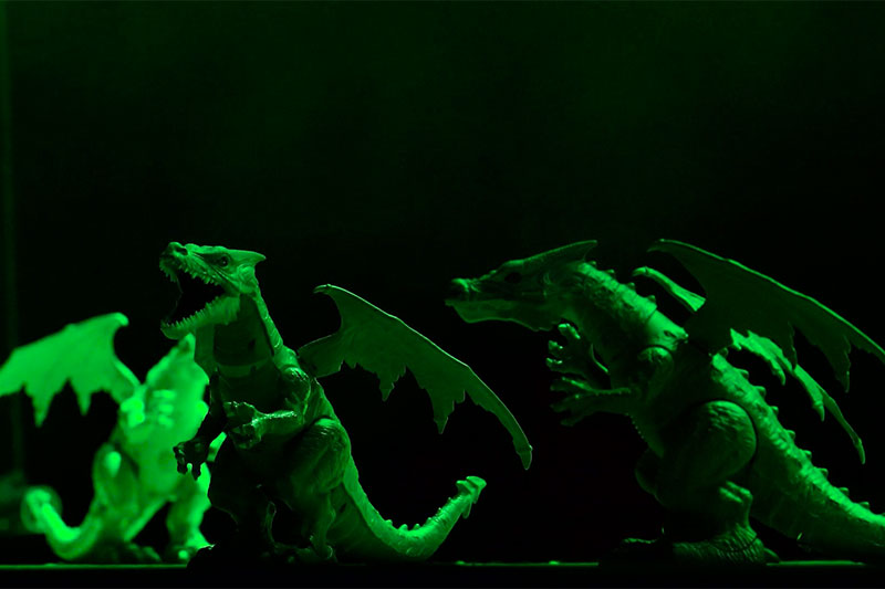 Per a l’escenificació de Post, vaig optar per un disseny lumínic tènue i minimalista, i vaig acompanyar la interpretació musical amb la presència silenciosa de set dragones de joguina hackejades que, en un moment determinat, es posen en moviment.